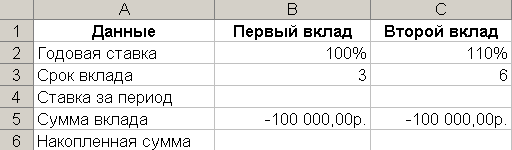 2)В 4және С4 ұяшығына екі үлестері үшін мерзімдік ставканы есептеніз. Бірінші үлес үшін мына формула қолданылады: =B2*B3/12 (100%*3/12), ,екінші үшін =C2*C3/12 (110%*6/12). 3)Жиналған соманы Бс функциясын пайдалана есептеніз. Бірінші үлес үшін =БС(B4;2;;B5), формуласын алыныз, төлемдердің саны- 2 (біз жарты жылда ақшаны рет саламыз). Екінші үшін: =БС(C4;1;;C5), тәлемдер саны - 1(біз ақшаны бір рет саламыз) 4)Алған нәтижелерді салыстырыңыз(7сурет) және қорытынды жасаныз.