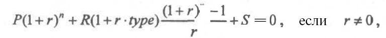 Р - қазіргі мән, S - келешектегі мән, R - периодтық төлем, r - мерзімге проценттік ставкі, n -мерзімдер саны, type- рента түрі,егер type = 0 немесе төмендетілсе,онда рента постнумерандо(төлем мерзім соныңда),егер type = 1, онда рента пренумерандо (төлем мерзімнің басында)