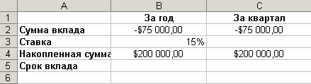 Сурет11 3. С3 ұяшығындағы тоқсандық ставканы өз алдына есептеңiз. 4. Егер пайыздарды есептеп шығару жылдың соңында болса үлес мерзiмнi есептейік.Ол үшiн В5 ұяшығына =КПЕР(B3;;B2;B4) немесе =КПЕР(15%;;-75000;200000)формуласын енгіземіз.. осы жағдайда ПЛТ дәлелі төмендетілген, өйткенi ешқандай да қосымша үлестер өндiрiп алмайды.