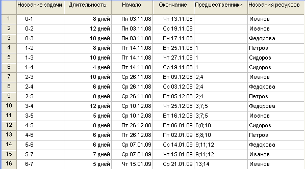 4. (графиктiң Вид/сетевасы) графиктiк торды қарап шығыңыз. Кризистiк жолдағы жұмыстары қызыл түс графиктiк торда қайтарған, бiрақ олар есептiң /Критическиенiң Проект/фильтрi команданы орындап бөлек қарап шығуға болады. 6. Жұмыс аптасының ұзақтығы анықтап алуға үшiн, жобаның жұмыс уақытының анықтауын есеп, бұдан әрi тармақтың мәзiрiнiң тармақтың панелiнде таңдаңыз. 7. Мысалы, қызметкерлердiң қоры және олардың еңбекақысы торлық графикпен байлауға үшiн), қорлар мәзiрдiң тармақтың панелiнде таңдаңыз, бұдан әрi опция жоба, келесi адымда үшiн адамдар және жабдықтың таңдауы сiлтеме бойынша өтiңiз қорлар қолдан енгiзуге таңдаңыз. 10-шi сурет сәйкес еңбек ресурстерiн тiзбенi жасаңыз. (Ортақ қыстырмада қор туралы барлық қорлардың Хабар-ошар диалогктiк терезесiнде үшiн қордың түрi Еңбектiк көрсетiңiз)