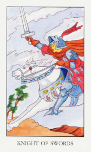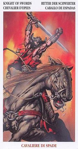 Рыцарь Мечей — это всегда нечто холодное, острое, коварное, несущее раздоры и споры, способное отравить даже те сферы жизни, которые до сих пор служили вам надежным, уютным убежищем. Символизируемый им холод может, конечно, разогнать туман и вывести на свет Божий всё, представлявшееся до сих пор неясным; однако чаще всего в этой карте стихия воздуха оборачивается к нам своей негативной стороной. Это означает холод отчуждения, острые дискуссии, резкие и дерзкие выводы, злой язык и едкую иронию. Поэтому Рыцарь Мечей часто предвещает ссору, разрыв отношений, яростную полемику и тщательно спланированную подлость. РАБОТА: Здесь он часто означает охлаждение отношений между коллегами, усиление розни и неприязни. Это — период напряженности, когда мы становимся слишком придирчивы к другим или, наоборот, сами подвергаемся критике. Иногда такая напряженность разрешается через очищающий, снимающий противоречия конфликт. Но чаще раны, наносимые и получаемые нами, бывают глубоки и долго не заживают. Эта карта олицетворяет «мороз», от которого лопается самый прочный фундамент. Это может обозначать крах проектов, планов и других деловых начинаний; при этом прекращается сотрудничество, обещавшее быть весьма плодотворным. В более «мягком» варианте — охлаждение первоначального энтузиазма. Уходит прежняя увлеченность, рушатся воздушные замки, и их место занимает здоровый скепсис и трезвая (само) критика. СОЗНАНИЕ: Рыцарь Мечей означает заметное охлаждение по отношению к прежним увлечениям, усиление критики или, возможно, самокритики. Нам удалось, наконец, взглянуть на самих себя или на окружающее «со стороны», и это вызвало у нас раздражение и повышенную склонность к конфликтам, для нас совершенно неожиданную. Нас обуревают сомнения, и мы начинаем относиться с насмешкой и презрением к тем ценностям, которые прежде были для нас дороже всего. Здесь эти «заморозки» тоже могут означать просветление, трезвую переоценку наших прежних, слишком поспешно усвоенных или просто «модных» представлений. ЛИЧНЫЕ ВЗАИМООТНОШЕНИЯ: В сфере личных отношений эта карта часто оборачивается к нам своей самой болезненной стороной. Здесь она означает не только внезапное охлаждение прежних теплых чувств, но и превращение их в свою противоположность — злость, ненависть или издевку. Она показывает, что даже глубокие чувства могут пасть жертвой пренебрежительных замечаний и язвительных острот, когда человек, серьёзно считая себя «справедливым» и «объективным», вытаскивает эти чувства из их укромного уголка на свет Божий, и они бьются, точно пойманная на крючок рыба, задыхаясь и умирая, иронизировать над чем может лишь человек абсолютно бессердечный.