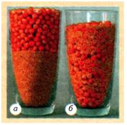 Рис. 2.13.Моделювання явища зменшення об'єму в результаті змішування різних рідин. Якщо взяти горох і пшоно (a) і ретельно перемішати їх, побачимо, що об'єм суміші менший за суму об'ємів її компонентів (б). Це можна пояснити тим, що крупинки пшона потрапили в проміжки між горошинами
