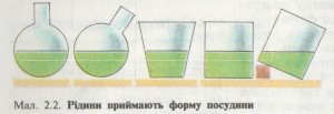 приймають форму посудини, яку заповнюють. На межі з повітрям рідина утворює власну вільну поверхню. Під дією тяжіння ця поверхня завжди горизонтальна, як би ми не нахиляли посудину. Якщо рідину перелити в іншу посудину, то вона набуде іншої форми, повторивши форму цієї посудини. Зазвичай ми говоримо: «тече вода», «ллється молоко», «витікає пальне». Не раз ми помічали, що розлита на підлогу рідина розтікається тонким шаром по її поверхні. Усі ці приклади ілюструють властивість рідин, яку називають текучістю. Вона використовується, наприклад, під час транспортування рідин. Так, вода по трубах надходить у будівлі, басейни і фонтани, нафта і рідке паливо тече у нафтопроводах, розплавлений метал металурги виливають у форми. Під час охолодження рідин до певної температури вони тверднуть, кристалізуються. Встановлено, що відбувається це за тієї самої температури, за якої дана речовина плавиться. Так, за природних умов вода стає льодом при 0 °С, але й лід тане також при 0 °С. Усе залежить від того, як відбувається цей процес —тіло дістає чи втрачає теплоту. Якщо, наприклад, в озері плаває лід, то він танутиме, коли температура повітря вища за 0 °С, тобто навколишнє середовище віддаватиме теплоту, і навпаки, при «мінусовій» температурі утворюватимуться нові брили льоду. Відомо, ЩО рідини можуть випаровуватися, тобто переходити у газоподібний стан. Легко переконатися, що чим вища їхня температу-па тим інтенсивніше відбувається цей про цес. Так, улітку калюжі висихають швидше, ніж навесні чи восени. За певної температури рідини починають інтенсивно випаровуватися не лише з поверхні але й усередині, з утворенням бульбашок. Це явище називається кипінням. За них умов вода кипить при плюс 100 С, аце ТОн—при плюс 56,5 °С, зріджене повітря при мінус 195 °С. Отже, на підставі узагальнення нашого досвіду можна зробити такий висновок: на відміну від твердих тіл рідини не мають власної форми і тому під дією сили тяжіння повторюють форму тієї посудини, яку заповнюють; рідини текучі і тому легко змінюють свою форму; на межі з повітрям вони утворюють вільну горизонтальну поверхню; під час охолодження за певної температури вони кристалізуються і тверднуть; рідини переходять у газоподібний стан через випаровування. Гази. Візьмемо м’яч, дитячу повітряну кульку і циліндр з поршнем або насос. Коли за допомогою насоса «накачати» повітрям, наприклад, футбольний м’яч чи кульку, вони набудуть округлої форми, яку задають їм оболонки (мал. 2.3)