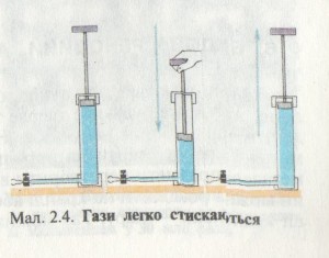 Очевидно, що всередині них повітря розподілилося по всьому об єму. І ази леткі і заповнюють увесь наданий їм об єм. Вони не мають власної вільної поверхні, як тверді тіла і рідини. Гази легко стискуються і так само легко розширюються, що можна продемонструвати за допомогою насоса (мал. 2.4).