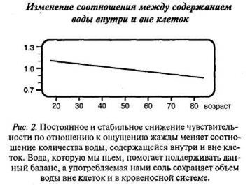 Теперь становится очевидным, что из-за неудовлетворенной жажды наш организм обезвоживается, начиная с раннего возраста, и состояние это переходит в хроническое. С возрастом содержание воды в клетках уменьшается до тех пор, пока соотношение объема воды внутри клеток и вне клеток не меняется с 1,1 до 0,8 (см. рис. 2). Это весьма печальное изменение. Поскольку вода, которую мы пьем, способствует функционированию клеток, то уменьшение потребляемой воды приводит к потере содержания воды внутри и отрицательно сказывается на их активности. В результате хроническое обезвоживание вызывает симптомы, которые трактуются как признаки различных заболеваний в силу нашего неумения распознавать сигналы жажды, которые подает наш организм. Как известно, эти настойчивые требования воды рассматриваются как отклонения от нормы, а справляются с ними при помощи лекарств. Человеческий организм может подвергнуться обезвоживанию даже в случае избытка воды. Ощущение жажды у людей притупляется, нарушается осмысление ими потребности организма в воде. Люди не отдают себе в этом отчета, и с возрастом их организм подвергается постоянному хроническому обезвоживанию (см. рис. 1 и 2). Дальнейшее заблуждение заключается в уверенности, что чай, кофе или алкогольные напитки в состоянии утолить жажду. Как вы узнаете, это весьма типичная ошибка.