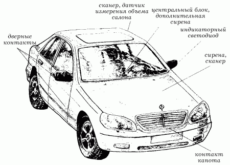 Сигнализация этого типа включает: – отдельный центральный блок; – сирену; – внешние датчики; – реле блокировки. Центральный блок устанавливается в салоне автомобиля в защищенном от доступа месте, и на него не влияют атмосферные воздействия. Обычно классическая сигнализация дополняется различными датчиками и исполнительными устройствами (управление центральным замком, замком багажника, люком, стеклоподъемником). Кроме того, есть большой набор сервисных функций. Узлы сигнализации рассредоточиваются, что делает ее более устойчивой к попыткам угона. Монтажные работы по установке такой сигнализации более сложны и предполагают хорошее знание автомобиля (рис. 128).