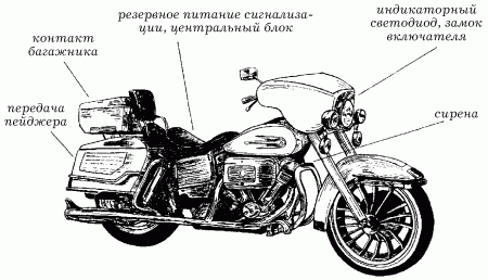 Рис. 128. Расположение блоков и датчиков в автомобиле. Сигнализацию устанавливают не только на автомобилях, но и на мотоциклах, где все механизмы управления открыты и жизненно важные элементы уязвимы. Поэтому охранная сигнализация для мотоциклов будет нелишней. Комплект сигнализации для мотоцикла содержит те же составные, что и для автомобиля. При монтажных работах следует очень тщательно маскировать его элементы. Расположение элементов сигнализации на мотоцикле показано на рис. 129.