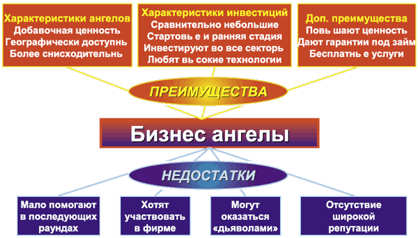 - Бизнес-ангелы предпочитают финансировать венчурные фирмы на самых ранних стадиях их развития. Бизнес-ангелы являются основным источником внешних финансовых ресурсов для вновь созданных компаний с высоким потенциалом роста. Бизнес-ангелы не боятся финансировать высокотехнологичные инновационные компании, несмотря на высокий риск невозврата вложенных средств.