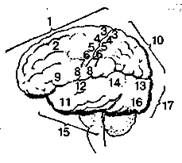 В мозгу можно выделить отдельные зоны его управления. Каждое действие, совершаемое человеком, такое, как смотрение, слушание или перемещение, находится под контролем соответствующей части мозга. 1 — передние лобные доли; 2 — моторные функции; 3 — ноги; 4 — туловище; 5 — руки; 6 — шея; 7 — лицо; 8 — язык; 9 — управление речью; 10 — теменные доли; 11 — контроль за вкусом и восприятием запахов; 12 — слух; 13 — височная доля; 14 — слух, речь; 15 — зрение, речь; 16 — зрение; 17 — затылочная доля