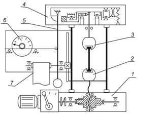 Рис. 3.4. Схема испытательной машины УММ-5 Машина УММ-5 имеет электромеханический привод (1) подвижного захвата (2), скорость перемещения которого может быть установлена с помощью рычага коробки скоростей. С неподвижным захватом (3) связан рычажно-маятниковый силоизмеритель (4). Возрастание усилия в верхнем неподвижном захвате (3) вызывает соответствующее отклонение маятника (5), происходит уравновешивание. Величина усилия показывается стрелкой на круговой шкале (6).