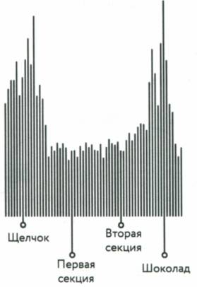 Лабиринт был устроен таким образом, что крыса находилась за перегородкой, которая открывалась после громкого щелчка. Поначалу крыса, услышав щелчок и увидев, как исчезает перегородка, начинала бродить туда-сюда по центру прохода, обнюхивать углы и скрестись в стены. Судя по всему, она чувствовала запах шоколада, но не могла сообразить, как найти его. Добравшись до верхней части буквы «Т», она часто поворачивала направо, удаляясь от шоколада, а затем шла налево, время от времени останавливаясь без видимой причины. В конце концов большинство животных находило шоколад-награду. Отчетливая схема в перемещениях крыс отсутствовала. Казалось, будто каждая крыса лениво и бездумно прогуливается взад-вперед. Однако датчики в головах крыс говорили другое. Когда животное бродило по лабиринту, его мозг, и особенно базальное ядро, неустанно работал. Каждый раз, когда крыса обнюхивала воздух или скреблась в стену, ее мозг яростно действовал, будто анализировал каждый новый запах, изображение и звук. Крыса обрабатывала информацию в течение всей прогулки. Ученые неоднократно повторяли эксперимент и наблюдали, как меняется мозговая активность каждой крысы по мере ее движения по одному и тому же маршруту сотни раз. Постепенно появился ряд изменений. Крысы перестали обнюхивать углы и поворачивать в ненужную сторону. Вместо этого они все быстрее и быстрее мчались по лабиринту. В то же время в их мозге происходило нечто неожиданное: как только крыса узнавала, как передвигаться по лабиринту, ее умственная активность снижалась. Чем выше становился уровень автоматизма при передвижении, тем меньше думали крысы. Казалось, будто в первые несколько экспериментов крысы изучали лабиринт и потому их мозг работал в полную силу, усваивал новую информацию. Однако, побегав несколько дней по одному и тому же маршруту, крыса уже не нуждалась в том, чтобы царапать стены или принюхиваться, поэтому мозговая активность, связанная с обнюхиванием и царапаньем, снизилась. Крысе не нужно было больше выбирать направление, поэтому центры мозга, ответственные за принятие решений, бездействовали. Теперь крысе требовалось только вспомнить кратчайший путь к шоколаду. Через неделю утихла активность даже мозговых центров, связанных с памятью. Крысы так хорошо освоили бег по лабиринту, что думать об этом им больше не требовалось. Однако, как показывали датчики в мозгу, усвоение элементов — бежать прямо, повернуть налево, съесть шоколад — опиралось на базальное ядро. Эта крохотная, древняя нервная структура руководила действиями крысы, бежавшей все быстрее и быстрее, а ее мозг в это время работал все меньше. Базальное ядро играет основную роль в запоминании моделей поведения и их выполнении. Другими словами, базальное ядро хранит привычки даже тогда, когда все остальные зоны мозга спят. Чтобы понять принцип действия этой способности, рассмотрим диаграмму[4]. На ней изображена активность, зарегистрированная в черепе крысы, впервые попавшей в лабиринт. Поначалу во время нахождения в лабиринте мозг работал очень интенсивно: