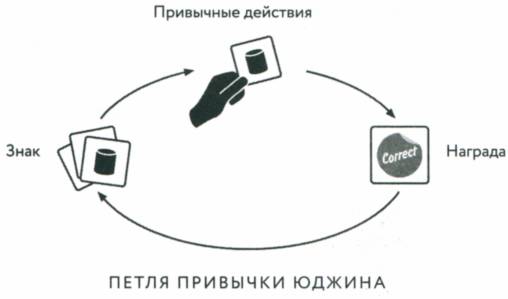 Эти скачки и есть способ, благодаря которому мозг определяет, когда и какой привычке нужно передать управление действиями. Находясь за перегородкой, крысе сложно понять, где она находится — в знакомом лабиринте или в незнакомом шкафу, рядом с которым сидит кошка. Неизвестность требует от мозга значительных усилий в начале привычки — ему нужна подсказка, намек, который поможет выбрать нужную модель поведения. Если крыса слышит щелчок, находясь за перегородкой, то понимает, что нужно использовать привычку лабиринта. Если она услышит мяуканье, то выберет другую привычку-модель. В конце действия крыса получает награду, и мозг просыпается, дабы убедиться, что все происходит именно так, как должно. Этот процесс происходит и в человеческом мозге в виде трехступенчатой петли. Во-первых, есть знак — пусковой механизм, который приказывает мозгу включить автоматический режим и сообщает, какую привычку выбрать. Затем происходят привычные действия — физические, умственные или эмоциональные. Наконец, третья ступень — награда, которая помогает мозгу понять, имеет ли смысл запомнить на будущее именно эту петлю.