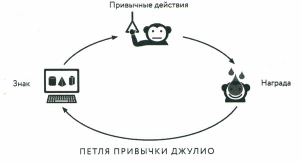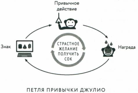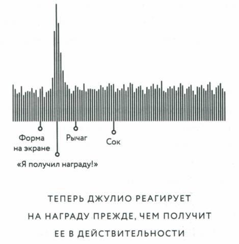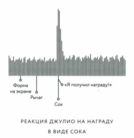 По мере изучения активности в мозге Джулио Шульц заметил определенную схему. Каждый раз при получении награды мозговая активность Джулио резко возрастала, что позволяло предположить, что он испытывает радость, счастье[7]. Расшифровка этой неврологической активности показывает, что мозге обезьяны будто говорит: «Я получил награду!» Шульц раз за разом проводил над Джулио тот же самый опыт и каждый раз записывал неврологическую реакцию. Каждый раз при получении сока схема «Я получил награду!» появлялась на компьютере, подключенном к датчику в мозге обезьяны. Постепенно поведение Джулио, с неврологической точки зрения, превратилось в привычку.
