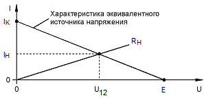IK = E / RВН. Параметры E, RВН и IK эквивалентного источника напряжения могут быть представлены на графике (рис.5.2) в виде характеристики IН = f(U). Здесь же показана характеристика нагрузки: U = RHIH.