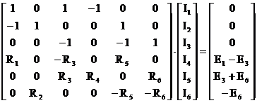 Схема содержит шесть ветвей с неизвестными токами, четыре узла и три элементарных контура. По первому закону Кирхгофа составляем три уравнения, то есть на одно меньше, чем количество узлов в схеме, а недостающие три уравнения составляем по второму закону Кирхгофа для трех элементарных контуров, направления обходов которых показаны на рис. 1.11. Узел 1: Узел 2: Узел 3: Контур I: Контур II: Контур III: Запишем полученную систему уравнений в матричной форме: