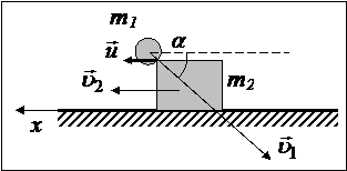 А вот ещё одна простенькая задачка, которая, тем не менее, может вызвать у Вас удивление: Снаряд массой m1 = 50 кг, летящий вдоль рельсов со скоростью u1 = 600 м/с, попадает в платформу с песком массой m2 = 10 тонн и застревает в песке. Вектор скорости снаряда в момент попадания образует угол a = 45° с горизонтом. Определить u - скорость платформы после попадания в неё снаряда, если платформа двигалась навстречу снаряду со скоростью u2 = 10 м/с. Что у нас происходит в задаче? Правильно, абсолютно неупругий удар. Аккуратно рисуем, что положено: состояние «непосредственно до» и «сразу после». Итак, «рисунок-условие»:
