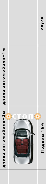 Площадка представляет собой эстакаду, т. е. наклонную поверхность, на которой необходимо остановить автомобиль, а затем тронуться с места. Длина наклонной поверхности равна длине автомобиля + 2 метра. На расстоянии 1м от верхней плоскости эстакады находится линия "стоп". При сдаче упражнения экзаменатору, сзади автомобиля на расстоянии 0.3 метра будет установлена дополнительная фишка. Что нужно сделать: