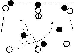 Если команда противника применяет зонную (см. рис.2) или комбинированную защиту (см. рис.3), то атакующая команда может начать свои действия с подвижной атаки. В этом случае атакующая команда применяет скоординированные прорывы подвижных нападающих в «убойные» зоны, чтобы вынудить соперника «раскрыться», и перейти к прессингу. А затем, прорывы нападающих производятся с помощью заслонов и перекатов.