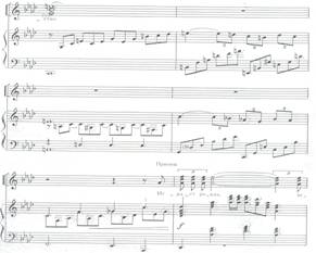 Пример напряжённого звучания в произведении, отклонение в es-moll Темп произведения изначально спокойный, но подвижный. Ускоряется с каждым новым куплетом. Первая фраза каждого куплета исполняется одноголосно, так же краткие моменты исполнения в унисон можно проследить по всему произведению. Например: