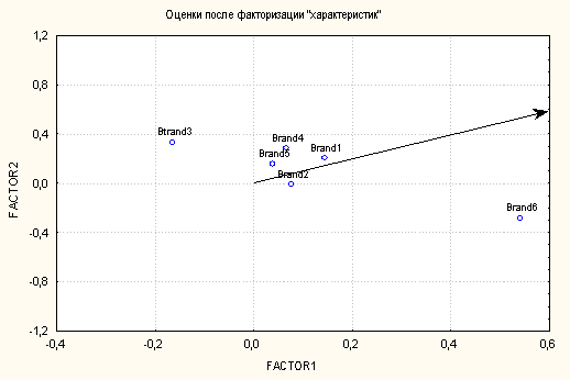 Как видно из приведенной выше карты, по первому фактору лидирует Brand6 и выраженность характеристики по первому фактору при традиционном подходе к интерпретации таких данных позволяла бы утверждать о лидирующем положении бренда. Проблема была опять же в отсутствии внешней валидности этих результатов. Проведение исследования по методике многомерного шкалирования позволило получить более информативное решение. Прежде всего, два первых фактора, полученных даже без улучшения модели, описывали уже 46% дисперсии (всего значимые факторы описывали около 2/3 дисперсии). Что более важно, полученные результаты обладали гораздо большей внешней валидностью: позиции 4 и 5 являлись активно рекламируемыми и конкурирующими брендами, а бренд1 занимал третью позицию. Бренды 2 и 6 по известности и использованию занимали последние места, а бренд 3 был широко известен и мифологизирован по историческим причинам, но на рынке практически не представлен.