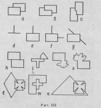 целом. Кое-что относительно фигур, изображенных на рис. 153, d — 153, g, мы уже говорили. В частности, мы отмечали, что то, что происходит в точках пересечения, зависит от контекста изображения. На рис. 153, d и 153, е прерванная линия не проявляет ни малейшего желания продолжаться дальше, за пределы вызвавшего это ограничение препятствия. На рис. 153, d чувствуется едва заметная тенденция к объемности, которая соответствует тому факту, что две прерываемые линии не являются независимыми друг от друга, а могут быть восприняты как части целого, имеющего форму прямого угла. В фигуре, изображенной на рис. 153, g, где принцип «согласующейся формы» усиливает связь между двумя линиями, последние сливаются в одну линию, которая продолжается свободно сзади прямоугольника. Конечно, на рис. 153 (d — g) мы не встречаем условий, описанных Рейтушем, а вот в изображениях на рис. 153 (h, i) эти условия имеются уже налицо. В соответствии со сформулированной им закономерностью противоречивые условия, возникающие в точках пересечения, должны создавать пространственную неопределенность наподобие той, которая изображена на рис. 153, b. Вместо этого мы не имеем никаких следов объемности. Если кто-либо станет утверждать, что так как нет никакого наложения, то эти примеры не имеют прямого отношения к разбираемой нами проблеме, то этот человек просто уходит от вопроса, так как проблема и состоит в том, чтобы выяснить, при каких условиях протекает процесс восприятия наложения. Изображение, показанное на рис. 153, h, могло бы быть с успехом выполнено двумя соприкасающимися фигурамл, изображенными на рис. 153, к. Вероятно, справедливым окажется утверждение о том, что когда условие Гельмгольца — Рейтуша действует в обеих точках пересечения в одном и том же направлении, то оно не может быть отвергнуто в значительной степени противоположной пространственной зависимостью. Однако композиции, представленные на рис. 153, l — п, показывают, что модели могут быть сконструированы таким образом, что в них изобразительная единица, контуры которой прерваны, стремится расположиться сверху. По общему признанию, этот эффект не действует в направлении общего контура, но даже и в этом случае объемность отсутствует, вместо того чтобы быть активной силой, как это предполагает закономерность Гельмгольца—Рейтуша. Причина этого заключается в том, что моделью с непрерывным контуром здесь является простая и завершенная фигура, которая не требует и не предполагает какого-либо добавления. Мы приходим к выводу, что принцип «согласующейся формы», если он рассматривается применительно к точкам пересечения контурных линий, вероятно, относится к самому мощному фактору, определяющему оверлэппинг. Что же касается закономерности, основанной на принципе простоты, то он, если мы хотим получить ценные предсказания, должен применяться в отношении модели в целом, а не только локально. При измерении глубины, когда пространственное представление о картине основывается на контуре, а не на данных объема или света, оверлэппинг имеет особую ценность для образования после довательности объектов. Для некоторых художников пространство