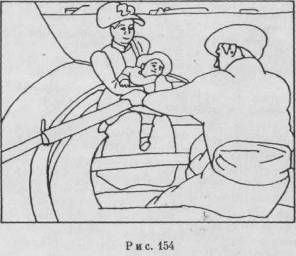 лучше всего реализуется, то есть становится для них реальным, благодаря бесконечным сериям частично налагающихся друг на друга предметов, которые наподобие верстовых столбов указывают дорогу от переднего плана картины к заднему. В качестве примера рассмотрим изображение, дающее схематическое очертание картины Мэри Кассат «Прогулка на лодке» (рис. 154). На этом рисунке все объекты изображены в пределах соответствующего масштаба: мужчина, его рука, покоящаяся на весле, ребенок, мать, нос лодки, вода и побережье. Даже за парусом, расположенным вне этой масштабной линии направления, с помощью изображения каната закрепляется определенное место. Роль наложения как пространственно-композиционного элемента хорошо известна в китайской пейзажной живописи. Соответственное взаимное расположение горных вершин и облаков устанавливается в этих картинах визуальным путем, а облик горы часто воспринимается как нагромождение горных уступов или слоев в зигзагообразном порядке. Общая контурная кривая достигается, таким образом, посредством своеобразного «интегрирования», основанного на сочетании фронтально расположенных плоскостей. Следует отметить, что указание на то, что модель должна выглядеть такой, как если бы в ней имело место наложение (в точках пересечения или еще где-либо), представляет собой лишь описание необходимых условий, а не объяснение эффекта объемности. Обычно дается следующее объяснение: мы видим в плоских картинах изображение глубины потому, что приспосабливаем к ним наш опыт обращения с объемными телами в физическом пространстве. Нам известно, что представляет собой пространственное отношение объектов, когда мы их воспринимаем как частично налагающиеся друг на друга. Эта теория звучит весьма неубедительно потому, что наше восприятие физического пространства также нуждается в объяснении, а выяснение данного вопроса — задача не из легких. Более предпочтительной представляется теория, основанная на тех принципах, которые были обоснованы нами несколько раньше. Так же как и в случае с элементарными ситуациями явления «фигура-фон», эффект объемности при частичном совпадении изобразительных единиц, по-видимому, возникает тогда, когда общая зрительно воспринимаемая модель становится с помощью оверлэппинга значительно проще. Если одна изобразительная единица препятствует соседней единице принять более простую форму (указание на которую содержится в ее облике), то достижение завершенности этой несовершенной формы становится возможной лишь в силу раскалывания модели на две фронтальные плоскости, которые располагаются на различном расстоянии от зрителя. Тем самым прерванный контур требует своего продолжения, которое может быть достигнуто только тогда, когда разорванная фигура воспринимается как продолжение под другой (непрерванной) фигурой. Этот эффект обладает достаточно большой силой, чтобы отвергнуть действительные различия в расстоянии. Мы можем изобразить единицы зрительно воспринимаемой модели па различных стеклянных пластинах и расположить их друг перед другом таким образом, что воспринимающий субъект увидит общую модель словно через смотровое отверстие. Герта Копферман показала, что если стеклянная пластина а (рис. 155) находится на расстоянии примерно 200 сантиметров перед зрителем, а пласти