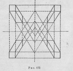 Благодаря наклонному расположению угловое пространство исключительно динамично. Большей частью в этом пространстве одна диагональ выделяется за счет другой, так что кажется, будто бы изображение пересекает визуальное поле наподобие поезда, который появляется в левом переднем углу фронтальной плоскости и исчезает в глубине справа, или наоборот. Следовательно, в подобном угловом пространстве имеется главная асимметрия. Симметрия жег которая была растеряна, когда наклонное расположение стало господствующим, может быть, однако, восстановлена на более сложном уровне методом" перспективы, который вводит наклонное расположение, но уравновешивает его. Изображенная на рис. 173 односторонняя фронтально-изометрическая конструкция дополнена ее зеркальными образами. С помощью такой процедуры разнообразные наклонные расположения могут уравновешивать друг друга, и, таким образом, достигается общая симметрия и повсеместная фронтальность. Так как мы привыкли к закономерности центральной перспективы, то неправильно представляем рис. 173 как единое пространство. На самом же деле мы имеем здесь комбинацию из нескольких самостоятельных пространственных конструкций. Это является менее очевидным, когда они (как это сделано на рис. 173) расположены симметричнои когда соответствующие удаляющиеся линии пересекаются с вертикалью или горизонталью (что изображено на рисунке пунктирными линиями). В литературе эти линии иногда называются «исчезающими осями». Это понятие вызывает в нашем сознании ошибочное представление, будто бы удаляющиеся края геометрической фигуры (в соответствии с центральной перспективой) совместно с общей осью пересекаются в воображаемой точке их встречи. В действительности же эти исчезающие оси являются лишь продуктами симметричного расположения этих фигур. Основное различие между этой процедурой и более поздним изобретением центральной перспективы состоит в том, что в методе, появившемся несколько ранее центральной перспективы, используется исчезающая ось вместо исчезающей точки. Основополагающее различие заключается в общем представлении. Центральная перспектива возвращается к единству пространства, временно потерянному, когда прямоугольники начали разбегаться во многих направлениях. На рис. 173 представлены четыре различных направления, по которым удаляются параллельные края и плоскости геометрических фигур, тогда как центральная перспектива объединяет все направления. По этой причине утверж-