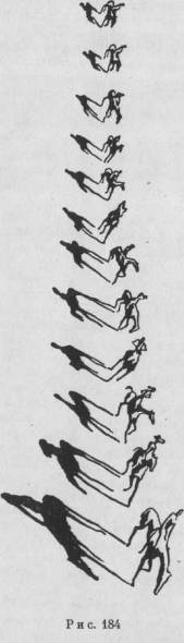 трехмерную форму, то глаз способен правильно соотнести руку с отбрасываемой тенью. Конечно, рис. 183 не соответствует произведению Рембрандта, так как здесь выделено всего две фигуры и показана одна тень, взятая отдельно от внушительной игры света, частью которой она является. Тем не менее, по-видимому, можно утверждать, что эффекты тени, носящие такой характер, сводят способность визуального понимания почти что на нет. Отбрасываемые тени следует использовать с осторожностью. В простейших случаях они непосредственно связаны с предметом, от которого они исходят. Например, тень человека встречается с его ногами на земле: а когда земля ровная и лучи солнца падают под углом в 45 градусов, тень дает неискаженный образ источника. Подобное дублирование вещей тенью, которая привязана к ним и которая имитирует их движения и в то же время является необычайно прозрачной и нематериальной, всегда привлекало внимание людей. Но даже при оптимальных условиях восприятия тени далеко не всегда самопроизвольно осознаются как световой эффект. Известно, например, что члены одного из западноафриканских племен избегают переходить через открытую площадь или просеку в полдень, потому что они боятся «потерять свою тень», то есть увидеть себя без нее. Однако их знание, что тени коротки в полдень, еще не означает понимания ими физических явлений. Когда их спрашивают, почему они в такой же степени не боятся вечерней тьмы, которая делает теки невидимыми, то они отвечают, что темнота подобной опасности с собой не несет, потому что «ночью все тени отдыхают в тени великого бога и набираются новых сил». После ночной «заправки» они появляются сильными и большими, то есть дневной свет как бы питается тенью, а не создает ее. Человеческое мышление, как интеллектуальное, так и перцептивное, ищет причины явлений как можно ближе к месту их воздействия. Тень рассматривается как часть объекта, который ее отбрасывает. Здесь мы опять находим, что темнота не выступает как отсутствие света, а считается положительной субстанцией со своими правами. Тонкая тень человека отождествляется с жизненной силой человека или его душой. Наступить на тень человека — значит нанести ему серьезное оскорбление. Его даже можно убить, пронзив его тень ножом. На похоронах следует не допускать, чтобы тень живого человека прихлопнула крышка гроба, так как в этом случае он будет похоронен вместе с трупом. Такие убеждения не следует игнорировать как суеверия, их необходимо воспринимать в качестве указания на стихийный процесс человеческого восприятия. Зловещее появление призрачного темного существа в кино, на сцене или на сюрреалистической картине продолжает оказывать свое воздействие на людей, которые изучали оптику в школе. Что касается объективных свойств отбрасываемых теней, то следует отметить, что они создают вокруг предмета пространство. На рис. 184 показано, насколько эффективно тени могут создать пространство.