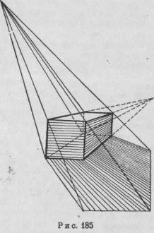 Следует сказать несколько слов о схождении теней. Поскольку солнце находится так далеко, что в довольно узком диапазоне пространства его лучи становятся практически параллельными, свет создает изометрическую проекцию тени, то есть линии, которые параллельны в объекте, параллельны также и в тени. Но тень подвержена перспективному искажению, так же как любой другой