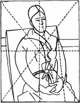 Этот нарастающий эффект усиливается целым рядом других особенностей. Три главных элемента картины перекрывают в пространственном отношении друг друга: шкала трех плоскостей ведет от заднего плана через кресло к самой фигуре. Эта трехмерная шкала поддерживается двухмерной серией ступенек, которая возникает от небольшого преломления темного пояса слева через угол кресла в направлении к голове. Подобным образом увеличение яркости ведет от темного пояска к светлому лицу и ладоням, которые представляют собой два композиционных центра, два композиционных фокуса. Ярко-красный цвет пальто способствует возвышению фигуры. Все эти факторы комбинируются в мощное, расширяющееся движение вперед. Три основных плана перекрываются в направлении от дальней левой стороны к ближней правой. Это вторичное движение вправо нейтрализуется расположением кресла, которое в основном находится в левой половине картины и, следовательно, создает тормозящее дополнительное движение влево. Но доминирующее движение вправо усиливается асимметричным по отношению к креслу расположением фигуры, так как фигура находится в правой половине кресла. Общее направление вправо усиливается в дальнейшем неравным делением фигуры, большая часть которой находится на левой стороне. (Нос делит лицо приблизительно в пропорции 5:2.) И снова глаз движется в направлении уменьшающихся интервалов, то есть слева направо. Клинообразный воротничок в свою очередь также увлекает наш взгляд в правую сторону. Фигура женщины и кресло наклонены примерно под одним углом относительно рамы. Напомним, что сами по себе все направления довольно неопределенны, поэтому данное направление наклона может быть влево вверх, вправо вниз или в обе стороны одновременно. Однако композиция целого помогает определить направления. Как верхняя часть фигуры, так и центр нижней части кресла находятся на центральной вертикальной оси картины. Данное расположение устанавливает в нижней части кресла точку опоры, относительно которой оно наклонено влево. Голова женщины, дважды стабилизированная своим положением — расположением на средней вертикали и в центре верхнего прямоугольника на заднем плане, — есть основание, относительно которого тело фигуры наклонено вперед и вправо. Таким образом, два композиционных центра расположены друг против друга. Голова — место локализации мозга, сознания и разума — покоится твердо. Руки — орудия труда — слегка выступают вперед, символизируя потенциальную активность. Но простой контрапункт осложняет ситуацию. Голова хотя и находится в состоянии покоя, но ее динамичное, асимметричное расположение «в профиль» и осторожные глаза содержат в себе элемент активности. Руки, хотя и выдвинуты вперед, сложены в спокойной симметричной форме. Наклоненное вперед положение фигуры взаимно уравновешивается тем, что основная масса женской фигуры прочно покоится в кресле и все это в свою очередь надежно расположено в нижней части картины. Верхняя часть женской фигуры свободно оканчивается в пространстве. Но свободное возвышение головы сдерживается не только ее центральным расположением, но также и ее близостью к верхней границе рамки картины, которая простирается над головой настолько, чтобы дать ей новое пристанище. Подобно тому, как в музыкальной гамме мелодия подым