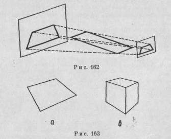 Модели в виде тех, которые представлены на рис. 163, могут быть получены путем фотографирования квадратов и кубов под наклонным углом. В объемномварианте эти модели очень часто приобретают форму физических объектов, проекцией которых они являются. Это явление побудило психологов сформулировать следующую психологическую закономерность. Несмотря на наличие искажений, возникающих на сетчатке глаза, объекты воспринимаются почти в соответствии с их физической формой и размером (принцип постоянства). Хотя для практических целей эта формулировка является, в общем, правильной, тем не менее она вводит нас в заблуж-