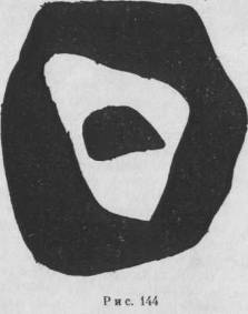 Термины «фигура» и«фон» удобны до тех пор, пока мы имеем дело с закрытой гомогенной моделью, которая также окружена однородной бесконечной средой. Но такие простые условия бывают весьма редко. Даже в большинстве наших элементарных примеров можно выделить больше чем два уровня. Например, крест на рис. 141 будет казаться изображенным на основании, образуемом окружностью, которая в свою очередь выступает как диск, лежащий на верху пустой плоскости, окружающей этот диск. Диск является фоном по отношению к кресту, но фигурой — для окружающей поверхности. Терминология эта довольно неудобная. По-видимому, более точно следует говорить о моделях, распределенных по различным уровням глубины, а модель «фигура—фон» будет тогда особым случаем конфигурации, свойственной сразу двум уровням. Когда в наличии имеются более чем две плоскости, в отношении вышеупомянутого правила необходимо внести поправки. Очевидно, было бы логично ожидать, что закрытая окружность, изображенная на рис. 143, будет восприниматься как фигура, расположенная на верху квадрата, который покоится в свою очередь на плоскости, выступающей в качестве основания. Вместо этого в данном случае мы воспринимаем квадрат, в котором сделано круглое отверстие. По-видимому, это происходит в результате действия принципа экономии, согласно которому число уровней модели будет по возможности самым наименьшим. Если окружность образует диск, лежащий на верху квадрата, то в результате мы имеем распределение по трем уровням, в то время как квадрат с круглым отверстием способствует образованию общей модели, имеющей всего лишь два уровня. Здесь меньшее число плоскостей, то есть модель, в числовом отношении представляющая более простой вариант. Мы делаем из этого вывод, что квадрат с круглым отверстием по сравнению с фигурой, расположенной в трех уровнях, представляет собой более простое решение. Физиологические причины подобного предпочтения пока еще не выяснены. Эту точку зрения можно проиллюстрировать более сложным примером. Рис. 144 представляет собой гравюру по дереву художника Ганса Арпа. Зрительные факторы сбалансированы относительно друг друга таким образом, что удовлетворяют сразу нескольким пространственным условиям. Эта гравюра может восприниматься нами как расположение четырех плоскостей (рис. 145,а), то есть как пирамида, состоящая из небольшого черного пятна на самом верху, под которым расположено белое пятно больших размеров, покоящееся в свою очередь на черном пятне. А в целом конструкция лежит на безграничном основании белого цвета. На рис. 145, b представлено трехплоскостное решение, в котором белое кольцо покоится на черном пятне. Два двухплоскостных решения даны на рис. 145, с и 145, d: большое черное кольцо с черным пятном посередине лежит на белом основании либо черный фон (основание) просматривается сквозь отверстие, образуемое контуром в сплошной белой