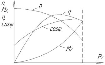 Вибрационные силы, действующие на асинхронную машину. Зубцовые и другие магнитные поля статора и ротора, образующие синхронный вращающийся момент проявляются не только при взаимно синхронном вращении, но и при любых других скоростях, в этом случае они образуют периодически вращающееся моменты, которые в течение одного полупериода направлены в обратном направлении. Такие периодически меняющиеся моменты создают вибрации ротора и отдельных частей машины, эти явления становятся особенно заметными при наличии резонансных явлений. При неблагоприятных соотношениях зубцов статора и ротора могут возникать не только тангенциальные составляющие, но и радиальные магнитные силы, действующие на статор и ротор и перемещающиеся вдоль окружности воздушного зазора, при вращении ротора эти силы вызывают вибрацию машины. Шумы при работе асинхронных машин могут возникать вследствие механических и магнитных колебаний. Механические причины шума зависят от балансировки ротора, состояния подшипников и колебания вентилирующего воздуха в каналах охлаждения. Более неприятный шум, вызванный магнитными явлениями, связанными с наличием высших гармоник магнитного поля. Стальные листы и отдельные ферромагнитные части машины, попадая в переменное магнитное поле Зубковой частоты, начинают колебаться. Рабочие характеристики асинхронных машин. Рабочие характеристики – это зависимости