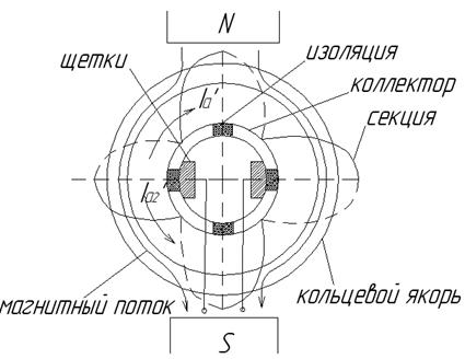 Самые первые машины постоянного тока были с кольцевыми якорями и представляли собой следующую конструкцию: