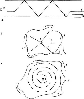 1. Направление движения собаки 2. Положение инструктора-проводника 3. Направление движения воздушных 4. Граница участка (полосы) поиска Рис. 4.2. Схемы тактических приемов кинологического поиска пострадавших в завалах: а - поиск «коридором» (челночный); б - поиск «веером»; в - поиск «спиралью»