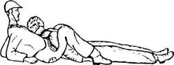 - - положить соединенные вместе запястья пострадавшего к се - отволакивать пострадавшего; - во время транспортировки поддерживать голову пострадав Отволачивание, двигаясь на спине (рис. 4.6). Действия спасателя: - слегка поднять пострадавшего за плечи; - пододвинуться своим телом под пострадавшего настолько, - пробираться вместе с пострадавшим спиной вперед, опира Отволачивание с помощью двух треугольных кусков ткани (рис. 4.7). Действия спасателя: - положить один треугольный кусок ткани под спину постра - положить узел себе на затылок и отволакивать пострадав Переноска на плечах. Этот способ применяется после приведения пострадавшего в приподнятое (стоячее, рис. 4.8 или сидячее, рис. 4.9) положение. Действия спасателя при приподнятом положении пострадавшего: - подступить ногой под стоящего (приподнятого) пострадав - приподняться и распределить вес пострадавшего на оба