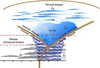 Фронты окклюзии (сложные фронты) образуются при смыкании холодного и теплого фронтов. Облачная система, связанная с этими фронтами, является наиболее сложной. Она включает в себя не только сомкнувшиеся системы холодного и теплого фронтов, но также и систему нижнего фронта, возникшую в результате нового взаимодействия масс на фронте окклюзии. В зависимости от характера взаимодействия облачная система фронта окклюзии может быть похожей или на систему теплого фронта (рис. 3.4), или на систему холодного фронта (рис. 3.5), но меньшую по своей протяженности.