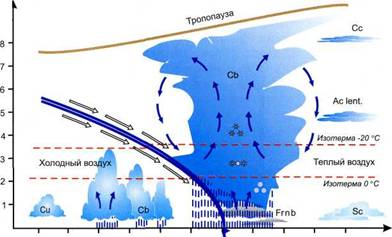 2 -1- Рисунок 3.2 — Система облаков холодного фронта первого рода. Если теплый воздух достаточно неустойчив, перед линией фронта образуются кучево-дождевые облака, дающие ливневые осадки. После прохождения СЬ заметного прояснения не наблюдается. Основная зона обложных осадков из Ns располагается уже за линией фронта. По мере дальнейшего надвижения облачной системы Ns переходят в As, осадки прекращаются и, наконец, наступает прояснение. Нередко после As наблюдаются также Cs. Под СЬ и Ns часто наблюдаются Frnb, которые в осенне-зимний период нередко могут замаскировать всю облачную систему. Холодный фронт второго рода — быстро движущийся холодный фронт. Теплый воздух, натыкаясь на быстро движущийся и обладающий относительно большим углом наклона клин холодного воздуха, поднимается вверх не плавно, а неупорядоченно, „порциями", в результате чего образуется конвективная облачность. Важную роль при этом играет неустойчивость воздушной массы, что благоприятствует развитию конвективных движений. Полоса наиболее мощных облаков и осадков располагается непосредственно перед линией фронта (рис. 3.3). Основной формой облаков в облачной системе холодного фронта второго рода являются кучево-дождевые. Незадолго до появления СЬ могут наблюдаться Ас, иногда сменяющиеся полосой As, и изредка Сс в сочетании с Ci. Одновременно с надвигающимися СЬ могут присутствовать и другие облака всех ярусов: Си, Frnb, Ac, As, Cc, Ci. Перед холодным фронтом второго рода иногда появляются Ac lent, и Сс lent., которые возникают примерно за 100 км перед СЬ. Ширина зоны СЬ также составляет около 100 км. Таким образом, в сравнительно узкой зоне вблизи линии фронта наблюдается большое разнообразие облаков, обусловленное мощной конвекцией, охватывающей практически всю тропосферу (до 7—9 км).