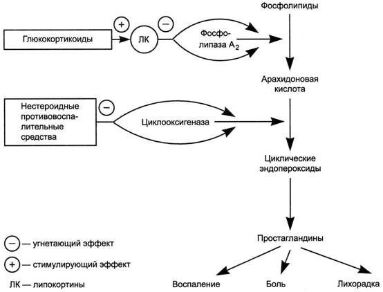 Рис. 10.8. Схема влияния противовоспалительных средств на биосинтез простагландинов.