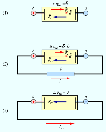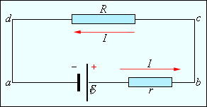 Эта формула выражет закон Ома для полной цепи: сила тока в полной цепи равна электродвижущей силе источника, деленной на сумму сопротивлений однородного и неоднородного участков цепи. Сопротивление r неоднородного участка на рис. 4.8.2 можно рассматривать как внутреннее сопротивление источника тока. В этом случае участок (ab) на рис. 4.8.2 является внутренним участком источника. Если точки a и b замкнуть проводником, сопротивление которого мало по сравнению с внутренним сопротивлением источника (R << r), тогда в цепи потечет ток короткого замыкания