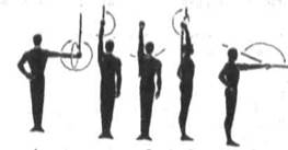 Рис. 12. Выполнение упражнений с палкой одной рукой Для определения движения и положения палки применяются следующие основные терминологические сочетания, которые зависят от способа удержания палки (за оба конца, со свободным концом): - палку горизонтально вниз, вперед, вверх, перед грудью, за голову, на лопатках, за спину вниз, за спину под локти и т.д. (при указанных способах, за исключением последнего, палка удерживается руками за концы; при необходимости другого хвата дается соответствующее указание); - палку вертикально вперед, левая сверху; вертикально перед грудью, правая сверху и т.д. (палка удерживается руками за концы); - палку к правому плечу вперед, к левому плечу в сторону и т.д. (при указанных способах один конец палки подносится к плечу, а палка вместе с вытянутой вдоль нее рукой принимает соответствующее термину положение); - правую с палкой вперед, левую с палкой вверх и т.д. (при этом палка удерживается за ближний конец и является продолжением вытянутой руки); - правую вперед, палку вверх; левую в сторону, палку вверх и т.д. (при этом палка удерживается за ближний конец, направление руки и палки не совпадают); - правую вперед, палку горизонтально; левую в сторону, палку вертикально и т.д. (при этом палка удерживается за середину). Дополнительно может указываться положение хвата кисти («Хват сверху»), положение рук (Руки согнуты в локтях»).