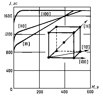 Магнитная анизотропия кубических монокристаллов железа. Приведены кривые намагничивания для трёх главных кристаллографических осей [100], [110] и [111] ячейки кристалла железа; J — намагниченность, Н — напряжённость намагничивающего поля.