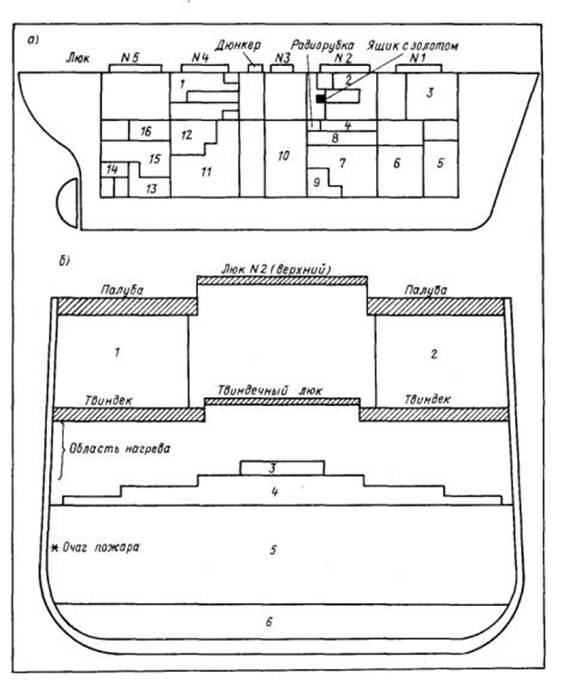 Рис. 2. Расположение грузов на пароходе «Форт Стайкин»: а – продольный разрез 1 – взрывчатка класса «В» (162 т); 2 – взрывчатка класса «А» (168 т); 3 – боеприпасы (115 т); 4 – железо (3 т); 5 – 900 мешков с серой (325 т); 6 – кипы хлопка (1268 т); 7 – 4100 кип с хлопком (769 т); 8 – древесина (11557 шт.); 9 – взрывчатка класса «С» (107 т); 10 – бочки со смазочным маслом (230 т); 11 – боеприпасы и взрывчатка (628 т); 12 – 2164 кипы с хлопком (405 т); 13 -1776 мешков риса; 14 – зерно в мешках; 15- 1045 кип хлопка (405 т); 16 – древесина (12300 шт);б – поперечный разрез по трюму № 2 1, 2 – взрывчатка; 3 – железо (3 т); 4 – древесина (463 т); 5 – 4100 кип хлопка; б-боеприпасы и взрывчатка.