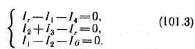 из трех участков (рис. 149). Направление обхода по часовой стрелке примем за положительное, отметив, что выбор этого направления совершенно произволен. Все токи, совпадающие по направлению с направлением обхода контура, считаются положительными, не совпадающие с направлением обхода — отрицательными. Источники э.д.с. считаются положительными, если они создают ток, направленный в сторону обхода контура. Применяя к участкам закон Ома (100.3), можно записать: