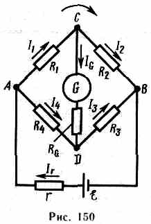 2. Выбрать направление обхода контура и строго его придерживаться; произведение IR положительно, если ток на данном участке совпадает с направлением обхода, и наоборот, э.д.с., действующие по выбранному направлению обхода, считаются положительными, против — отрицательными. 3. Составить столько уравнений, чтобы их число было равно числу искомых величин (в систему уравнений должны входить все сопротивления и э.д.с. рассматриваемой цепи); каждый рассматриваемый контур должен содержать хотя бы один элемент, не содержащийся в предыдущих контурах, иначе получатся уравнения, являющиеся простой комбинацией уже составленных. В качестве примера использования правил Кирхгофа рассмотрим схему (рис. 150) измерительного моста Уитстона. Сопротивления R 1, R 2, R 3 и R 4 образуют его плечи. Между точками А и В моста включена батарея с э.д.с. ξ и сопротивлением r, между точками С и D включен гальванометр с сопротивлением RG. Для узлов А, В и С, применяя первое правило Кирхгофа, получим