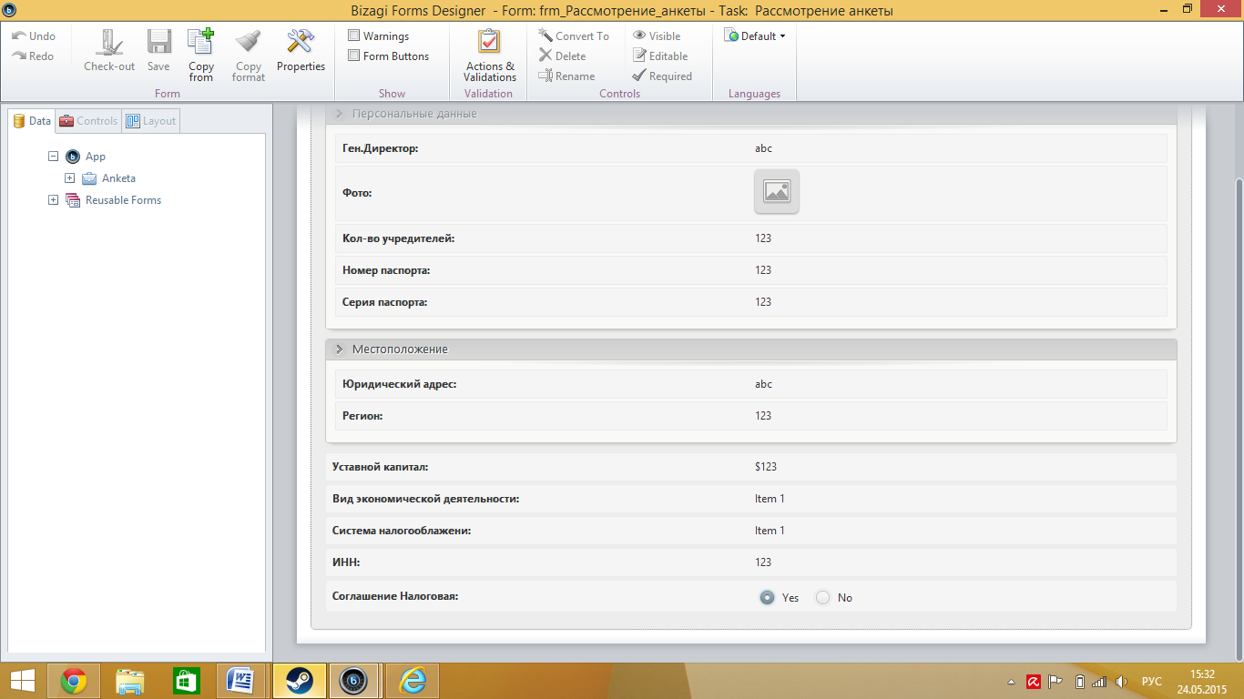 Рис.10 Форма составление анкеты Следующая форма Рассмотрение анкеты налоговой, при её создание используем форму Заполнение анкеты, точнее копируем её и добавляем, в эту анкету так же добавляется одобрение налоговой и ИНН,который генерируется самостоятельно. В случае не заполнения галочки, идёт перенос на форму В регистрации отказано.
