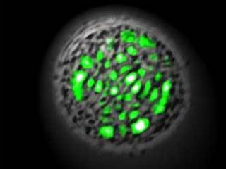 Так биологический лазер выглядит под микроскопом. Его пучок имеет пятнистое сечение (фото Malte C. Gather, Seok Hyun Yun/Nature Photonics). Исследователи из медицинской школы Гарварда (HMS) методами генной инженерии создали человеческие эмбриональные клетки почки, производящие медузий зелёный флуоресцентный белок (он присутствовал по всей клетке). Затем учёные поместили одну такую клетку между двух зеркал, получив оптический резонатор поперечником в 20 микрометров. Когда клетку через микроскоп освещали наносекундными импульсами голубого света (в качестве накачки), она испускала направленный когерентный лазерный луч зелёного цвета. Пучок был довольно слабый, но всё же видимый невооружённым глазом. При этом клетка не была повреждена и оставалась живой даже после длительной работы в роли лазера.