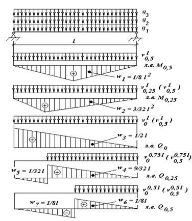 Рисунок 2 – Линии влияния внутренних усилий в главной балке соответственно
