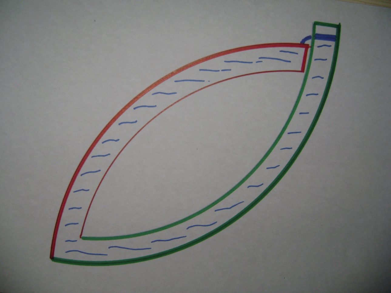 Форма Вечного Двигателя. Практически у меня была попытка сделать – трубку такой формы, с жидкостью. Теоретически жидкость должна самостоятельно циркулировать внутри. Практически в трубке маленького диаметра – жидкость неподвижна. Эффект слабый, заметно по весам, а тут вязкость трение и т.д. Но, если его сделать достаточно большим, (у меня пока просто нет такой возможности), то выглядеть он должен как на следующем рисунке.