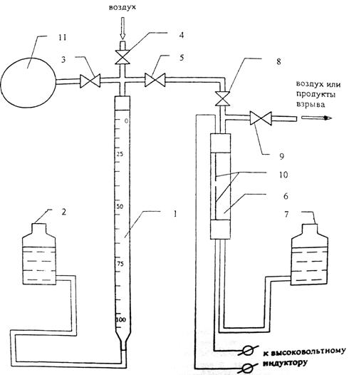 1- бюретка; 2,7- аспираторы; 3,4,5,8,9- краны для ввода таза, воздуха, перекачки смеси и вывода воздуха или продуктов взрыва; 6- взрывная трубка; 10- электроды: 11- резиновая камера с испытуемым газом